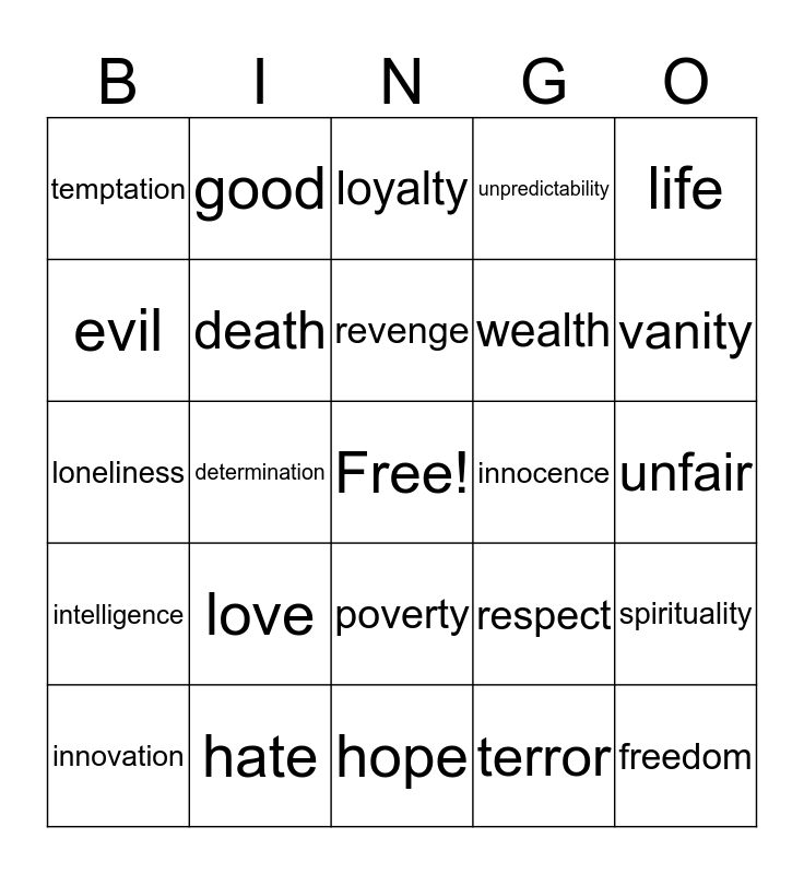 This bingo card has a free space and 24 words: love, hate, revenge, innovation, life, temptation, evil, good, innocence, poverty, wealth, loneliness, respect, spirituality, death, terror, unfair, loyalty, vanity, determination, freedom, intelligence, unpredictability and hope.