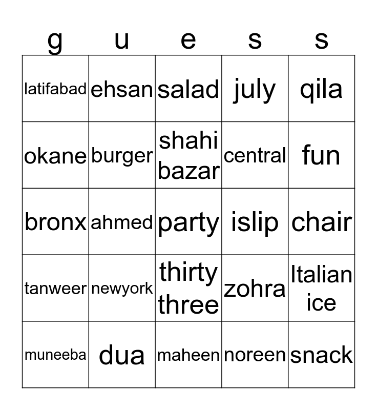 This bingo card has a free space and 24 words: newyork, dua, shahi bazar, muneeba, qila, latifabad, okane, ehsan, islip, thirty three, central, bronx, zohra, Italian ice, burger, noreen, chair, salad, fun, ahmed, snack, tanweer, july and maheen.