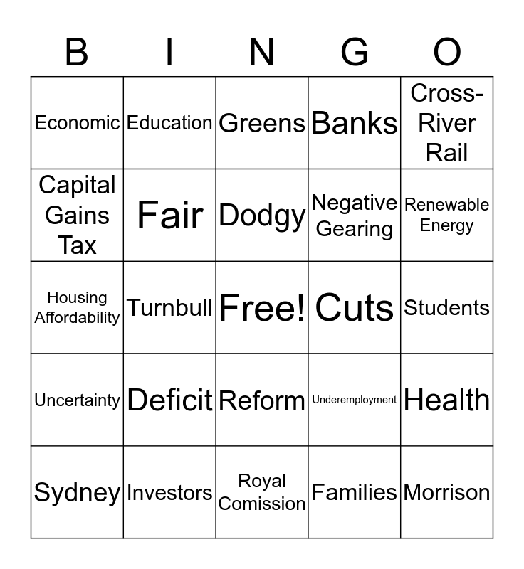 This bingo card has a free space and 24 words: Deficit, Investors, Dodgy, Sydney, Cross-River Rail, Economic, Capital Gains Tax, Education, Cuts, Reform, Negative Gearing, Housing Affordability, Underemployment, Health, Fair, Families, Students, Greens, Renewable Energy, Turnbull, Morrison, Uncertainty, Banks and Royal Comission.