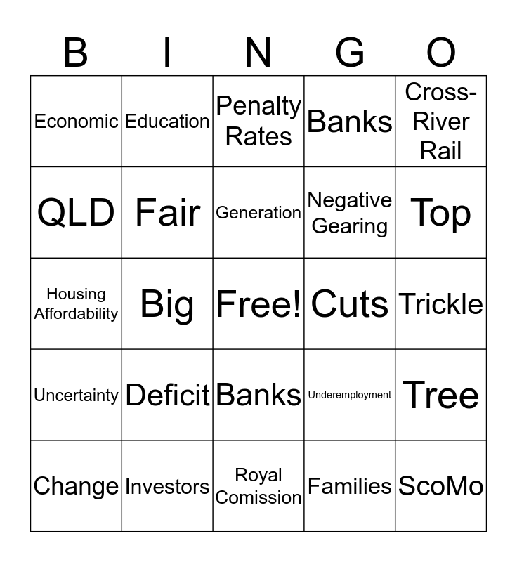 This bingo card has a free space and 24 words: Deficit, Investors, Generation, Change, Cross-River Rail, Economic, QLD, Education, Cuts, Banks, Negative Gearing, Housing Affordability, Underemployment, Tree, Fair, Families, Trickle, Penalty Rates, Top, Big, ScoMo, Uncertainty, Banks and Royal Comission.