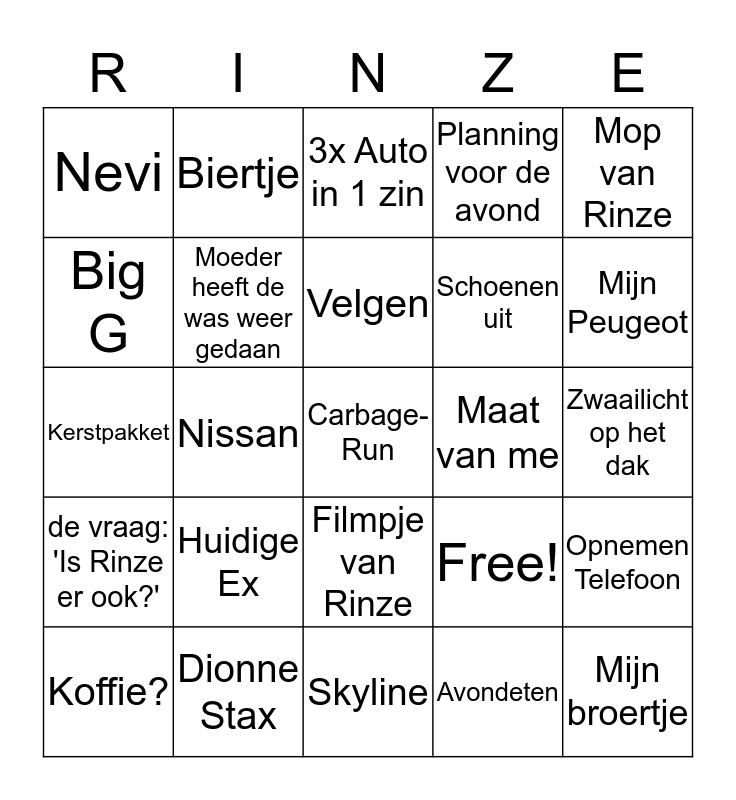 This bingo card has 25 words: Huidige Ex, Skyline, Velgen, Koffie?, Mop van Rinze, Nevi, Big G, Biertje, Maat van me, Filmpje van Rinze, Schoenen uit, Kerstpakket, Free!, Opnemen Telefoon, Moeder heeft de was weer gedaan, Mijn broertje, Zwaailicht op het dak, 3x Auto in 1 zin, Mijn Peugeot, Nissan, Carbage-Run, Dionne Stax, de vraag: 'Is Rinze er ook?', Planning voor de avond and Avondeten.