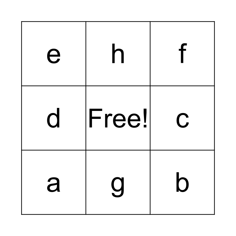 This bingo card has a free space and 8 words: c, f, h, a, e, b, d and g.