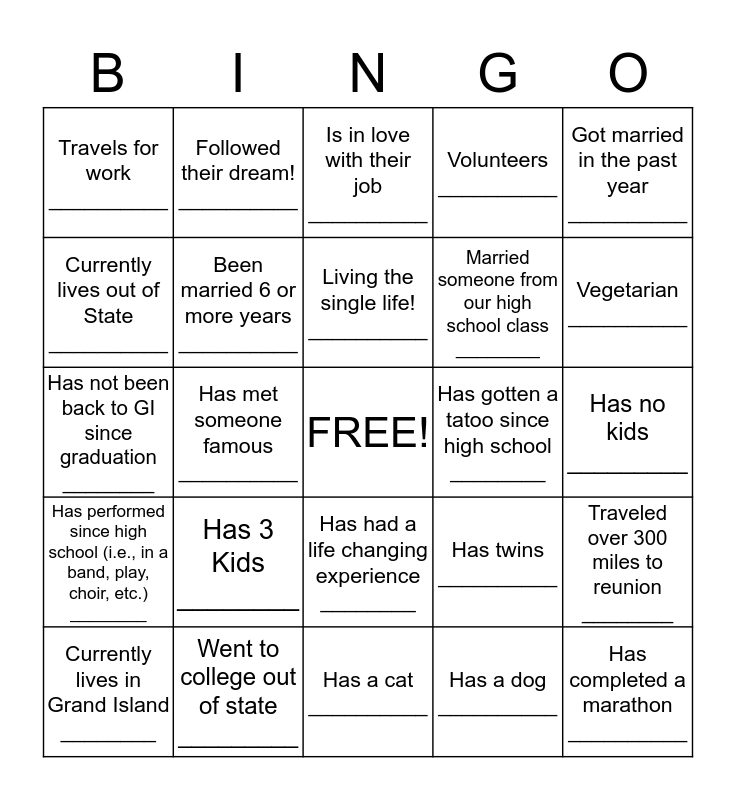 This bingo card has a free space and 24 words: Has 3 Kids ________, Went to college out of state _________, Living the single life! __________, Currently lives in Grand Island ________, Got married in the past year __________, Travels for work __________, Currently lives out of State __________, Followed their dream! __________, Has gotten a tatoo since high school ________, Has had a life changing experience ________, Married someone from our high school class ________, Has not been back to GI since graduation ________, Has twins __________, Traveled over 300 miles to reunion ________, Been married 6 or more years __________, Has a dog __________, Has no kids _________, Is in love with their job __________, Vegetarian __________, Has met someone famous __________, Has completed a marathon __________, Has performed since high school (i.e., in a band, play, choir, etc.) ________, Volunteers __________ and Has a cat __________.
