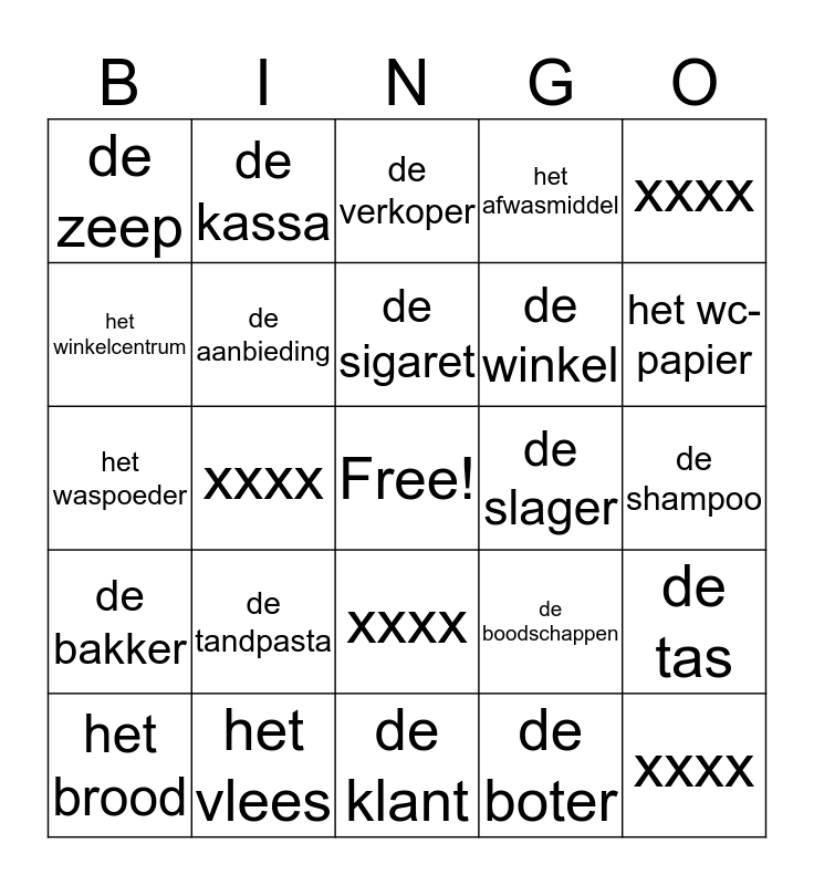 This bingo card has a free space and 27 words: de boodschappen, de supermarkt, de winkel, de klant, het winkelcentrum, de verkoper, de kassa, de bakker, de slager, de tas, het waspoeder, het afwasmiddel, het brood, het vlees, het wc-papier, het pakje, de aanbieding, de sigaret, de tandpasta, de zeep, de shampoo, de boter, xxxx, xxxx, xxxx, xxxx and xxxx.