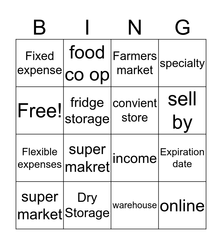 This bingo card has 16 words: Dry Storage, Expiration date, Farmers market, Fixed expense, Flexible expenses, food co op, income, warehouse, Free!, fridge storage, super market, specialty, super makret, sell by, convient store and online.