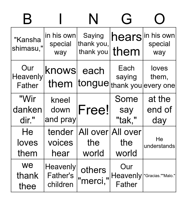 This bingo card has a free space and 24 words: tender voices hear, Heavenly Father's children, each tongue, we thank thee, in his own special way, "Kansha shimasu,", Our Heavenly Father, in his own special way, Some say "tak,", All over the world, Each saying thank you, "Wir danken dir.", All over the world, He understands, knows them, Our Heavenly Father, at the end of day, Saying thank you, thank you, loves them, every one, kneel down and pray, "Gracias.""Malo.", He loves them, hears them and others "merci,".