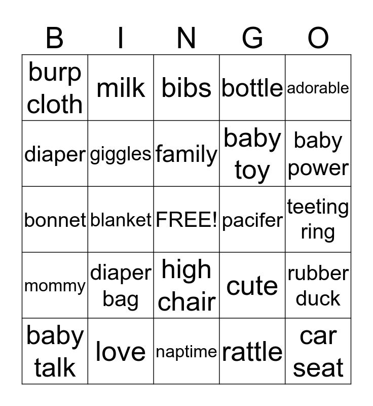 This bingo card has a free space and 29 words: baby talk, crib, blanket, booties, burp cloth, bibs, giggles, diaper bag, pacifer, love, teeting ring, car seat, naptime, rattle, baby power, daddy, high chair, mommy, adorable, bonnet, cute, stroller, baby toy, diaper, bottle, milk, rubber duck, family and cooing.