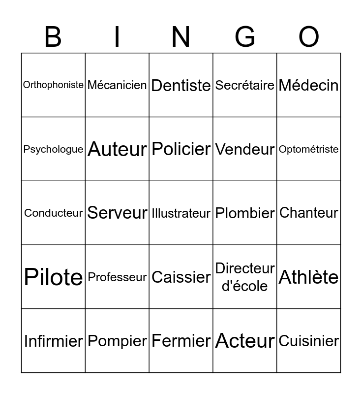 This bingo card has a free space and 24 words: Professeur, Pompier, Policier, Infirmier, Médecin, Orthophoniste, Psychologue, Mécanicien, Plombier, Caissier, Vendeur, Conducteur, Directeur d'école, Athlète, Auteur, Acteur, Chanteur, Dentiste, Optométriste, Serveur, Cuisinier, Pilote, Secrétaire and Fermier.