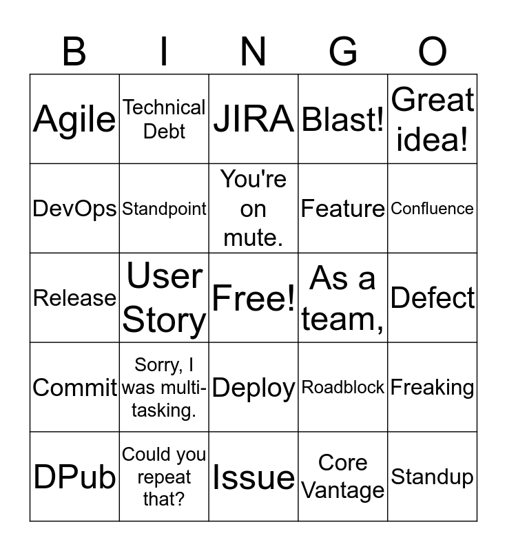 This bingo card has a free space and 24 words: Sorry, I was multi-tasking., Could you repeat that?, You're on mute., DPub, Great idea!, Agile, DevOps, Technical Debt, As a team,, Deploy, Feature, Release, Roadblock, Freaking, Standpoint, Core Vantage, Defect, JIRA, Confluence, User Story, Standup, Commit, Blast! and Issue.