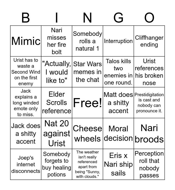 This bingo card has a free space and 24 words: Nat 20 against Urist, Somebody forgets to buy healing potions, Star Wars memes in the chat, Joep's internet disconnects, Cliffhanger ending, Mimic, Urist has to waste a Second Wind on the first enemy, Nari misses her fire bolt, Matt does a shitty accent, Cheese wheels, Talos kills two enemies in one round., Jack explains a long winded emote only to miss., Moral decision, Nari broods, "Actually, I would like to", Eris x Nari ship sails, Prestidigitation is cast and nobody can pronounce it., Somebody rolls a natural 1, Urist references his broken nose, Elder Scrolls reference, Perception roll that nobody passes, Jack does a shitty accent, Interruption and The weather isn't really referenced apart from being "Sunny, with clouds.".