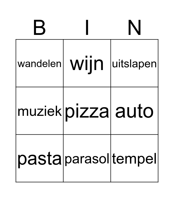 This bingo card has a free space and 11 words: zee, parasol, tempel, pasta, wijn, uitslapen, auto, vulkaan, muziek, wandelen and toerist.