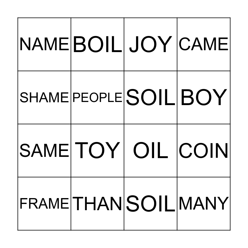 This bingo card has 16 words: THAN, COIN, JOY, NAME, SAME, BOIL, OIL, SOIL, SHAME, PEOPLE, FRAME, CAME, TOY, BOY, SOIL and MANY.