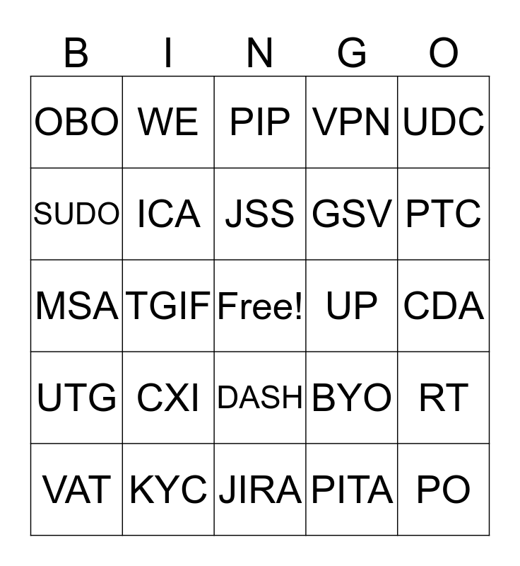 This bingo card has a free space and 24 words: CXI, KYC, JSS, VAT, UDC, OBO, SUDO, WE, UP, DASH, GSV, MSA, BYO, RT, ICA, PITA, CDA, PIP, PTC, TGIF, PO, UTG, VPN and JIRA.