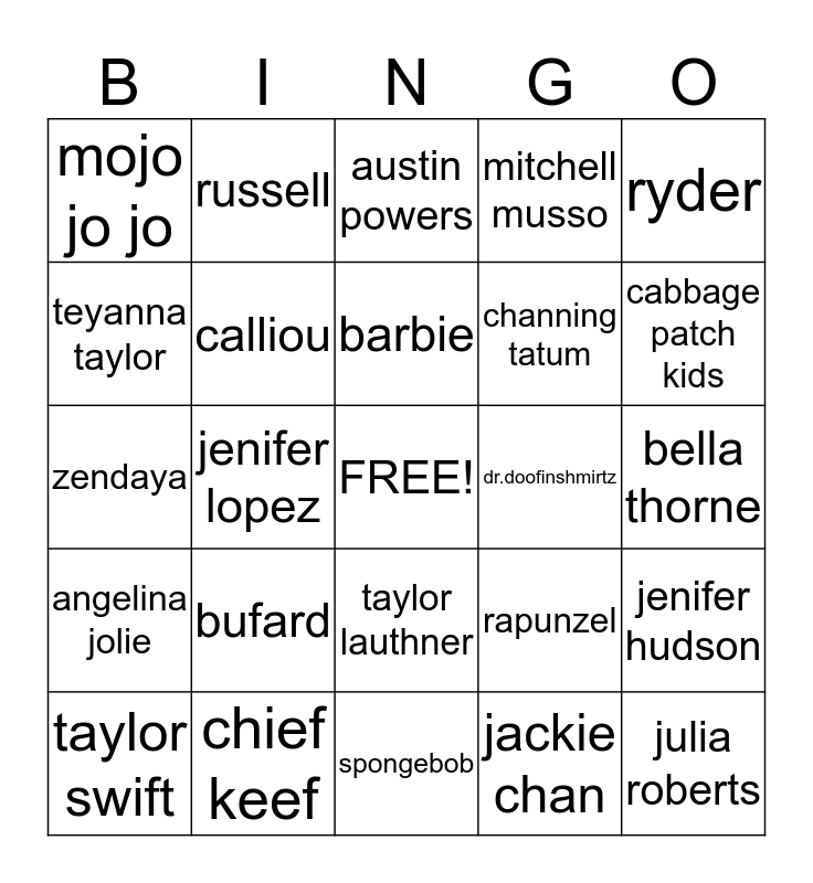 This bingo card has a free space and 24 words: bufard, chief keef, barbie, taylor swift, ryder, mojo jo jo, teyanna taylor, russell, dr.doofinshmirtz, taylor lauthner, channing tatum, zendaya, rapunzel, jenifer hudson, calliou, jackie chan, bella thorne, austin powers, cabbage patch kids, jenifer lopez, julia roberts, angelina jolie, mitchell musso and spongebob.