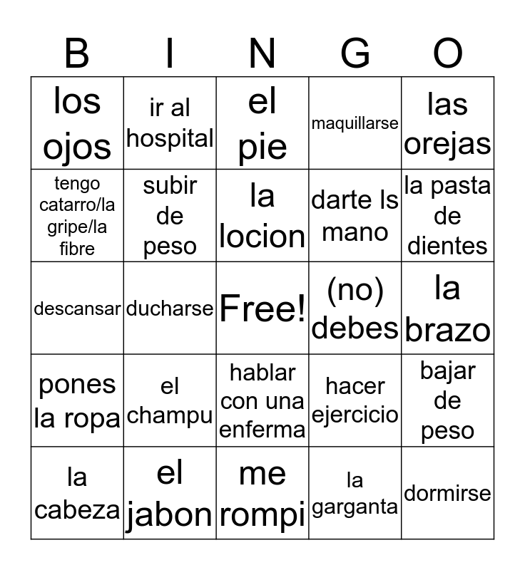 This bingo card has a free space and 24 words: el champu, el jabon, la locion, la cabeza, las orejas, los ojos, tengo catarro/la gripe/la fibre, ir al hospital, (no) debes, hablar con una enferma, darte ls mano, descansar, hacer ejercicio, bajar de peso, subir de peso, la garganta, la brazo, el pie, la pasta de dientes, ducharse, dormirse, pones la ropa, maquillarse and me rompi.