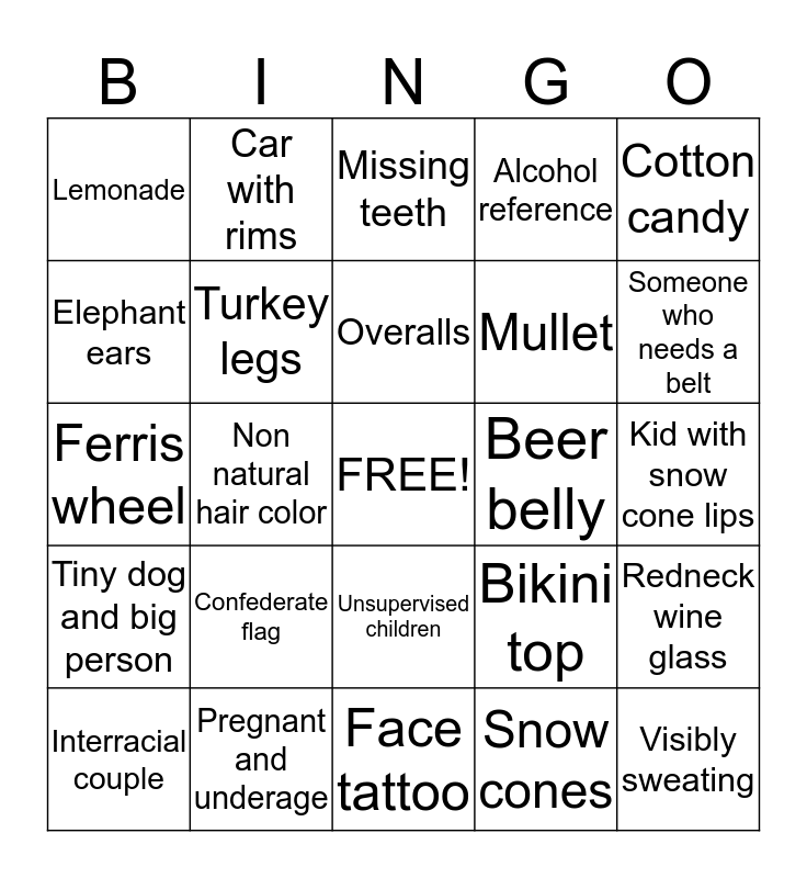 This bingo card has a free space and 24 words: Confederate flag, Pregnant and underage, Overalls, Interracial couple, Cotton candy, Lemonade, Elephant ears, Car with rims, Beer belly, Unsupervised children, Mullet, Ferris wheel, Bikini top, Redneck wine glass, Turkey legs, Snow cones, Kid with snow cone lips, Missing teeth, Someone who needs a belt, Non natural hair color, Visibly sweating, Tiny dog and big person, Alcohol reference and Face tattoo.