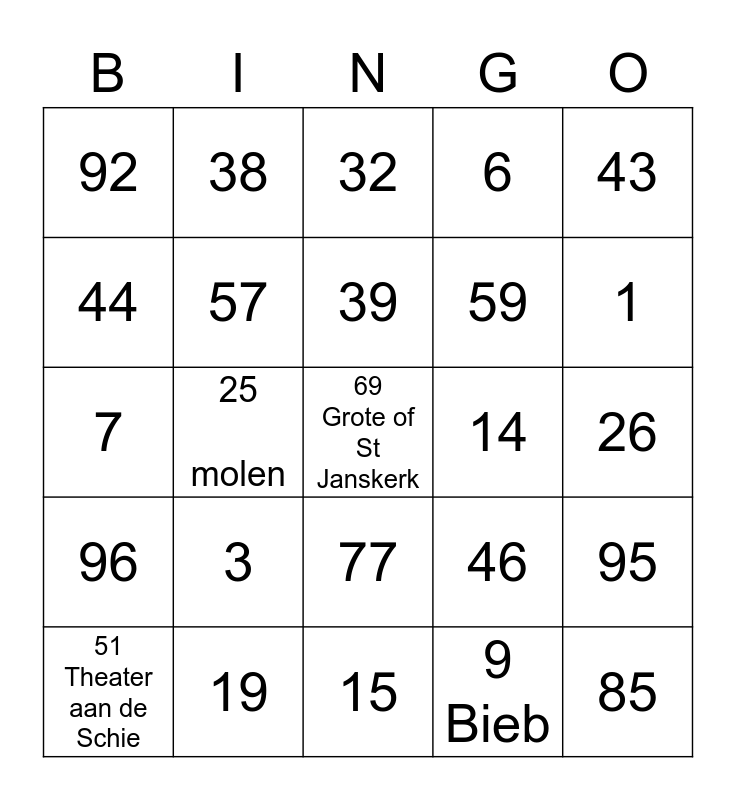 This bingo card has a free space and 24 words: 3, 19, 39, 51 Theater aan de Schie, 43, 92, 44, 38, 14, 77, 59, 7, 46, 95, 57, 9 Bieb, 26, 32, 1, 25 molen, 85, 96, 6 and 15.