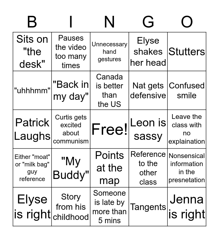 This bingo card has a free space and 24 words: "My Buddy", Story from his childhood, Canada is better than the US, Elyse is right, Stutters, Sits on "the desk", "uhhhmm", Pauses the video too many times, Leon is sassy, Points at the map, Nat gets defensive, Patrick Laughs, Reference to the other class, Nonsensical information in the presnetation, "Back in my day", Tangents, Leave the class with no explaination, Unnecessary hand gestures, Confused smile, Curtis gets excited about communism, Jenna is right, Either "moat" or "milk bag" guy reference, Elyse shakes her head and Someone is late by more than 5 mins.