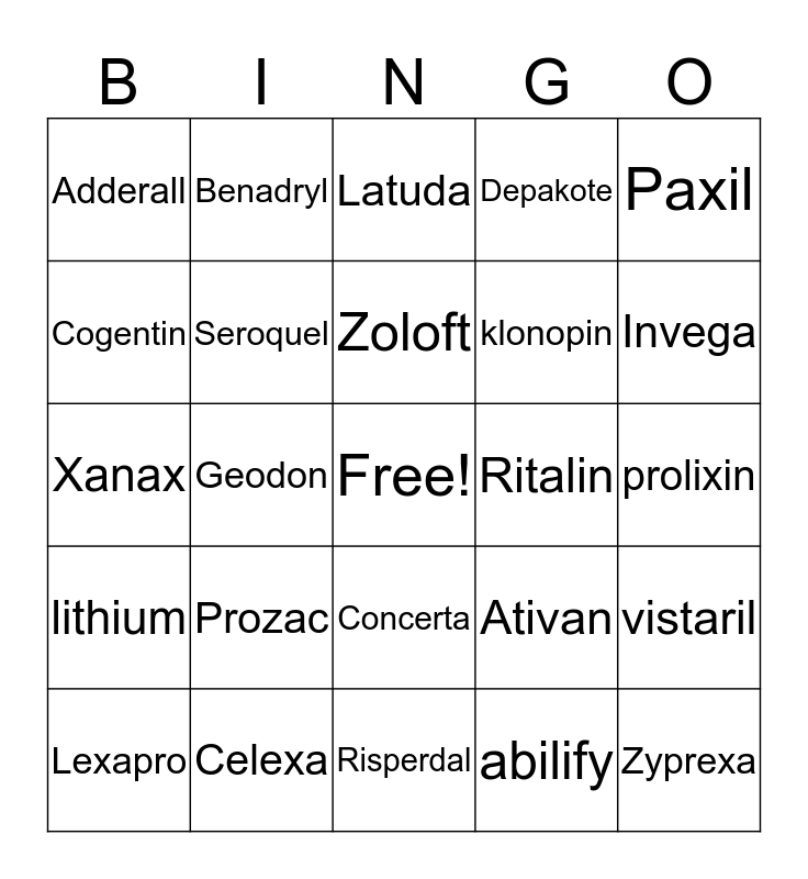 This bingo card has a free space and 24 words: Prozac, Celexa, Zoloft, Lexapro, Paxil, Adderall, Cogentin, Benadryl, Ritalin, Concerta, klonopin, Xanax, Ativan, vistaril, Seroquel, abilify, prolixin, Latuda, Invega, Geodon, Zyprexa, lithium, Depakote and Risperdal.