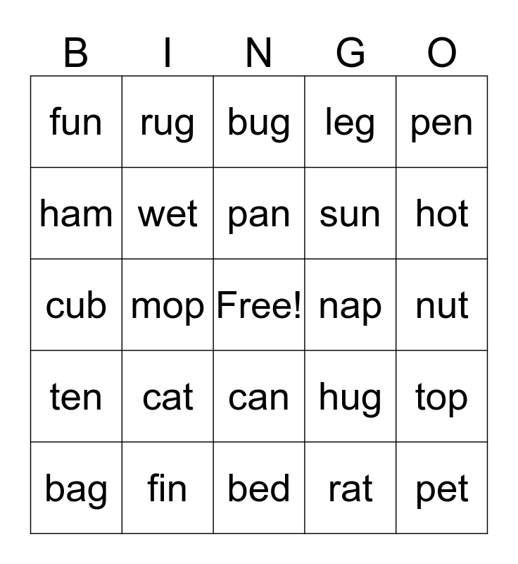 This bingo card has a free space and 24 words: cat, fin, pan, bag, pen, fun, ham, rug, nap, can, sun, cub, hug, top, wet, rat, nut, bug, hot, mop, pet, ten, leg and bed.