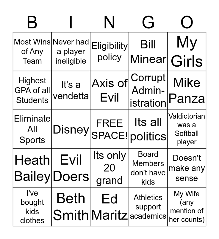 This bingo card has a free space and 24 words: Evil Doers, Beth Smith, Axis of Evil, I've bought kids clothes, My Girls, Most Wins of Any Team, Highest GPA of all Students, Never had a player ineligible, Its all politics, Its only 20 grand, Corrupt Admin-istration, Eliminate All Sports, Board Members don't have kids, Doesn't make any sense, It's a vendetta, Athletics support academics, Valdictorian was a Softball player, Eligibility policy, Mike Panza, Disney, My Wife (any mention of her counts), Heath Bailey, Bill Minear and Ed Maritz.