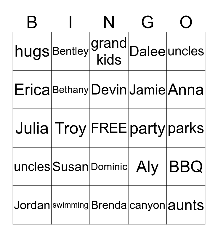This bingo card has a free space and 24 words: Susan, swimming, Devin, Jordan, uncles, hugs, Erica, Bentley, party, Dominic, Jamie, Julia, Aly, BBQ, Bethany, canyon, parks, grand kids, Anna, Troy, aunts, uncles, Dalee and Brenda.