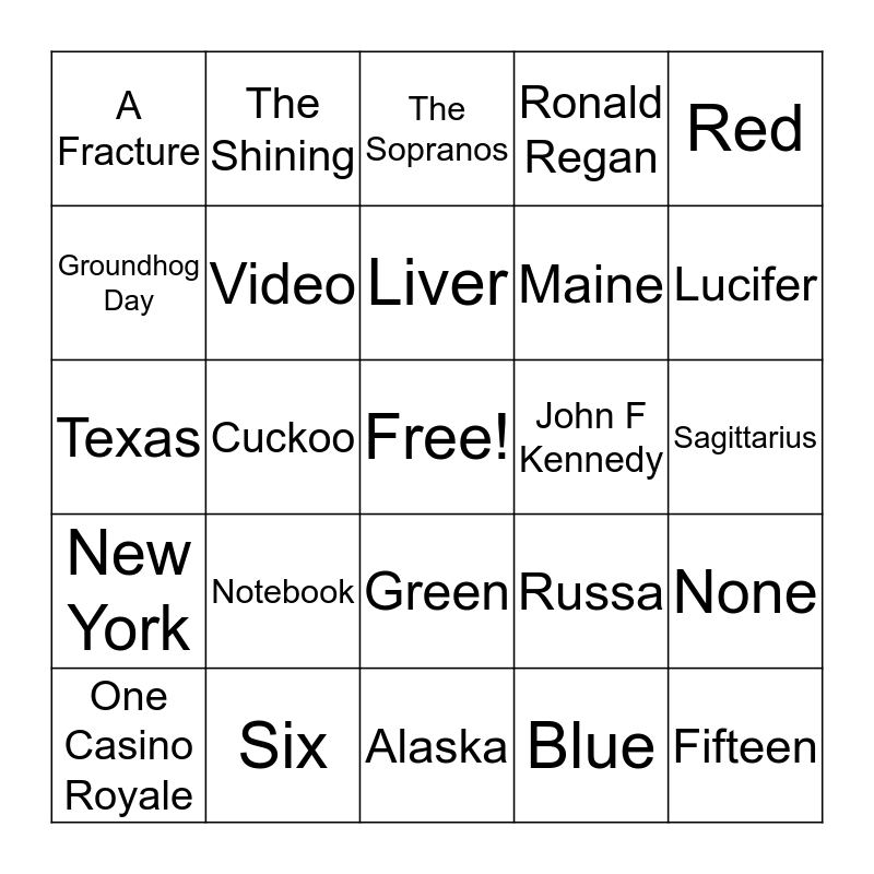This bingo card has a free space and 27 words: Russa, The Flamingo, Maine, Alaska, Groundhog Day, The Sopranos, The Shining, New York, John F Kennedy, None, Texas, Ronald Regan, One Casino Royale, Six, Lucifer, Acid Rain, Video, Liver, Notebook, A Fracture, Sagittarius, Blue, Cuckoo, Fifteen, Green, Red and Billie Jean King.