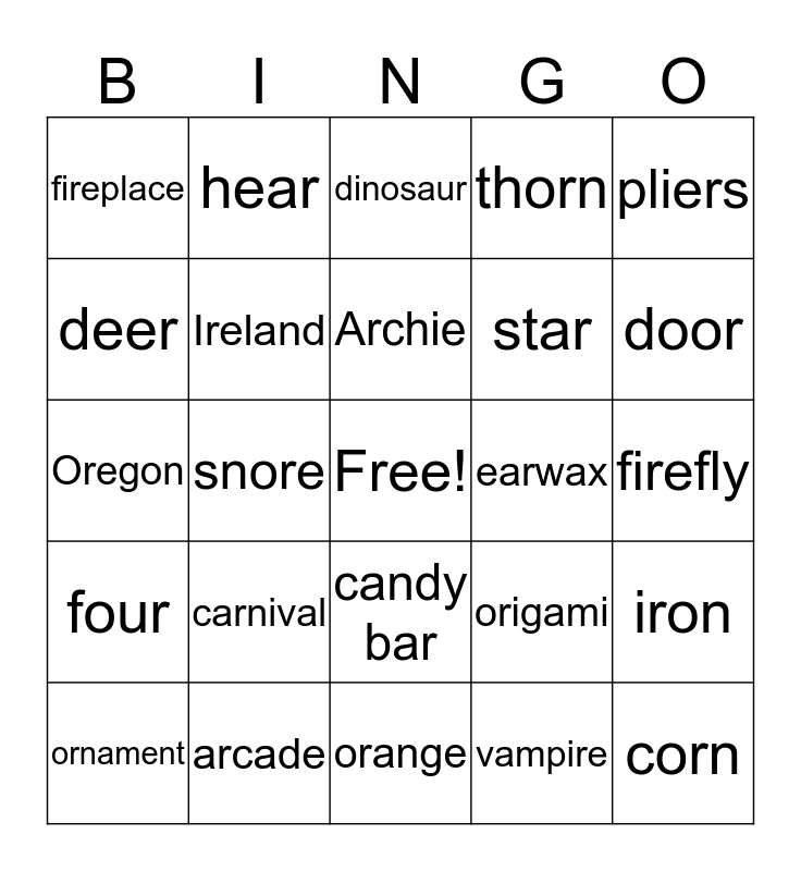 This bingo card has a free space and 24 words: carnival, arcade, Archie, ornament, pliers, fireplace, deer, hear, earwax, candy bar, star, Oregon, origami, iron, Ireland, vampire, firefly, dinosaur, door, snore, corn, four, thorn and orange.