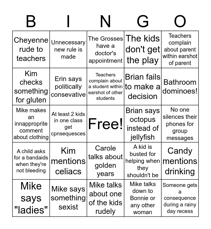 This bingo card has a free space and 24 words: Kim mentions celiacs, Mike says something sexist, Teachers complain about a student within earshot of other students, Mike says "ladies", Teachers complain about parent within earshot of parent, Cheyenne rude to teachers, Kim checks something for gluten, Unnecessary new rule is made, Brian says octopus instead of jellyfish, Carole talks about golden years, Brian fails to make a decision, Mike makes an innapproprite comment about clothing, A kid is busted for helping when they shouldn't be, Candy mentions drinking, Erin says politically consevative, Mike talks down to Bonnie or any other woman, No one silences their phones for group messages, The Grosses have a doctor's appointment, Bathroom dominoes!, At least 2 kids in one class get cpnsequesces, Someone gets a consequence during a rainy day recess, A child asks for a bandaids when they're not bleeding, The kids don't get the play and Mike talks about one of the kids rudely.