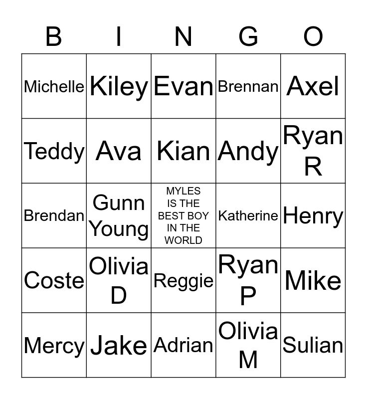 This bingo card has a free space and 24 words: Olivia D, Jake, Kian, Mercy, Axel, Michelle, Teddy, Kiley, Katherine, Reggie, Andy, Brendan, Ryan P, Mike, Ava, Olivia M, Henry, Evan, Ryan R, Gunn Young, Sulian, Coste, Brennan and Adrian.
