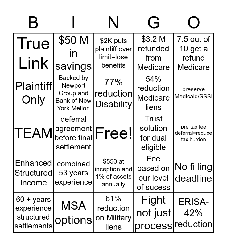 This bingo card has a free space and 24 words: combined 53 years experience, MSA options, 77% reduction Disability, 60 + years experience structured settlements, 7.5 out of 10 get a refund Medicare, True Link, Plaintiff Only, $50 M in savings, Trust solution for dual eligible, $550 at inception and 1% of assets annually, 54% reduction Medicare liens, TEAM, Fee based on our level of sucess, No filling deadline, Backed by Newport Group and Bank of New York Mellon, Fight not just process, pre-tax fee deferral=reduce tax burden, $2K puts plaintiff over limit=lose benefits, preserve Medicaid/SSSI, deferral agreement before final settlement, ERISA-42% reduction, Enhanced Structured Income, $3.2 M refunded from Medicare and 61% reduction on Military liens.