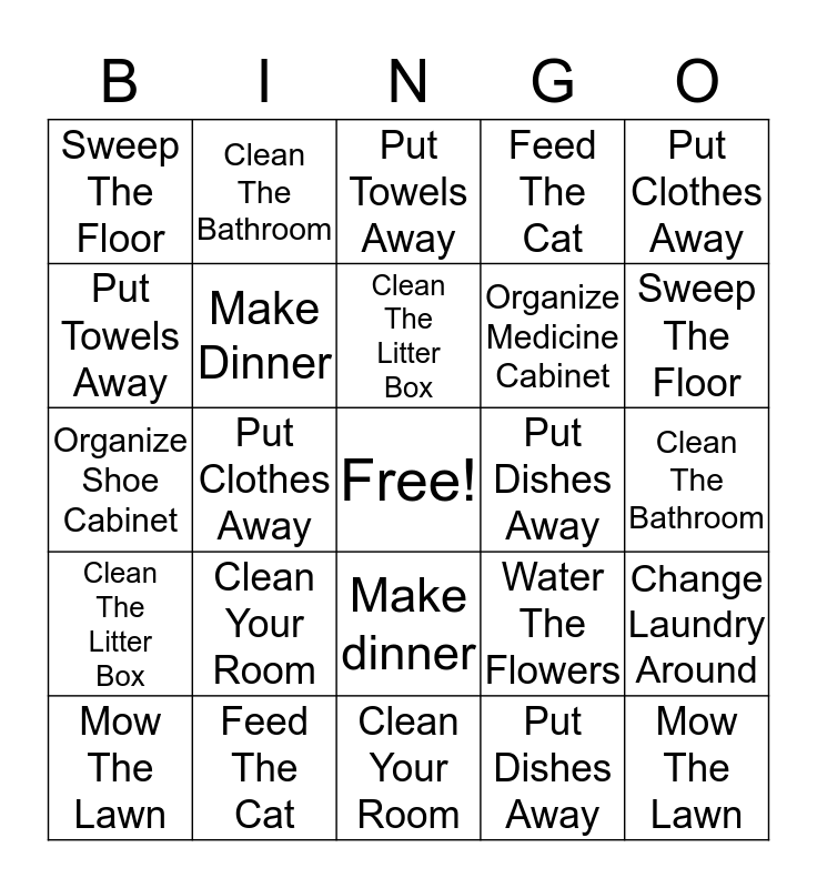 This bingo card has a free space and 24 words: Clean Your Room, Feed The Cat, Clean The Litter Box, Mow The Lawn, Put Clothes Away, Sweep The Floor, Put Towels Away, Clean The Bathroom, Put Dishes Away, Make dinner, Organize Medicine Cabinet, Organize Shoe Cabinet, Water The Flowers, Change Laundry Around, Make Dinner, Put Dishes Away, Clean The Bathroom, Put Towels Away, Sweep The Floor, Put Clothes Away, Mow The Lawn, Clean The Litter Box, Feed The Cat and Clean Your Room.