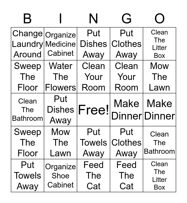 This bingo card has a free space and 24 words: Mow The Lawn, Organize Shoe Cabinet, Clean Your Room, Put Towels Away, Clean The Litter Box, Change Laundry Around, Sweep The Floor, Organize Medicine Cabinet, Make Dinner, Put Towels Away, Clean Your Room, Clean The Bathroom, Put Clothes Away, Clean The Bathroom, Water The Flowers, Feed The Cat, Make Dinner, Put Dishes Away, Mow The Lawn, Put Dishes Away, Clean The Litter Box, Sweep The Floor, Put Clothes Away and Feed The Cat.