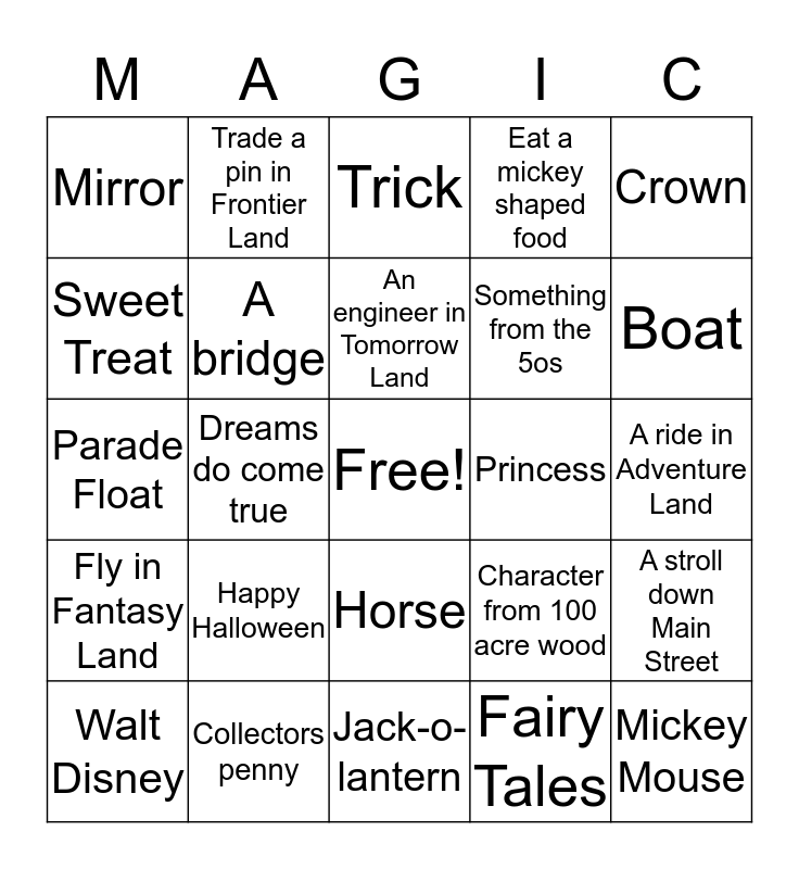This bingo card has a free space and 24 words: Happy Halloween, Collectors penny, An engineer in Tomorrow Land, Walt Disney, Crown, Mirror, Sweet Treat, Trade a pin in Frontier Land, Princess, Horse, Something from the 5os, Parade Float, Character from 100 acre wood, A stroll down Main Street, A bridge, Fairy Tales, A ride in Adventure Land, Trick, Boat, Dreams do come true, Mickey Mouse, Fly in Fantasy Land, Eat a mickey shaped food and Jack-o-lantern.