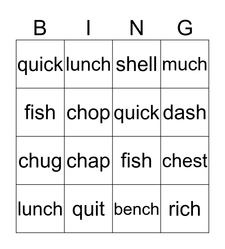 This bingo card has 39 words: quit, quiz, quack, quick, quilt, shed, dash, crash, fish, rich, chest, much, lunch, bench, quit, quiz, quack, quick, quilt, chin, chop, rich, chug, chap, inch, chest, bench, pinch, bunch, lunch, munch, shed, shell, shop, mash, fresh, crash, fish and dish.