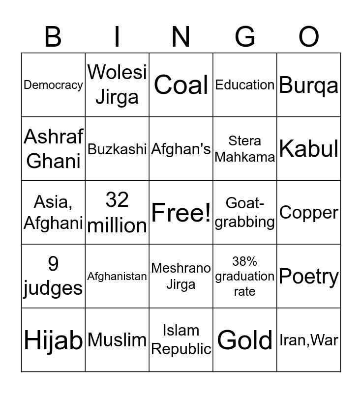 This bingo card has a free space and 24 words: Afghanistan, Muslim, Afghan's, Hijab, Burqa, Democracy, Ashraf Ghani, Wolesi Jirga, Goat-grabbing, Meshrano Jirga, Stera Mahkama, Asia, Afghani, 38% graduation rate, Poetry, Buzkashi, Gold, Copper, Coal, Kabul, 32 million, Iran,War, 9 judges, Education and Islam Republic.