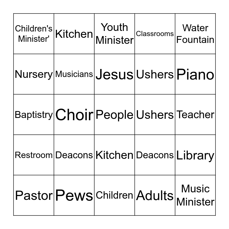 This bingo card has 29 words: Pastor, Pulpit, Choir, Music Minister, Children's Minister', Youth Minister, Musicians, Deacons, Ushers, Pews, Teacher, People, Children, Adults, Piano, Organ, Kitchen, Restroom, Water Fountain, Baptistry, Deacons, Sound Room, Ushers, Nursery, Classrooms, Kitchen, Library, Jesus and Love.