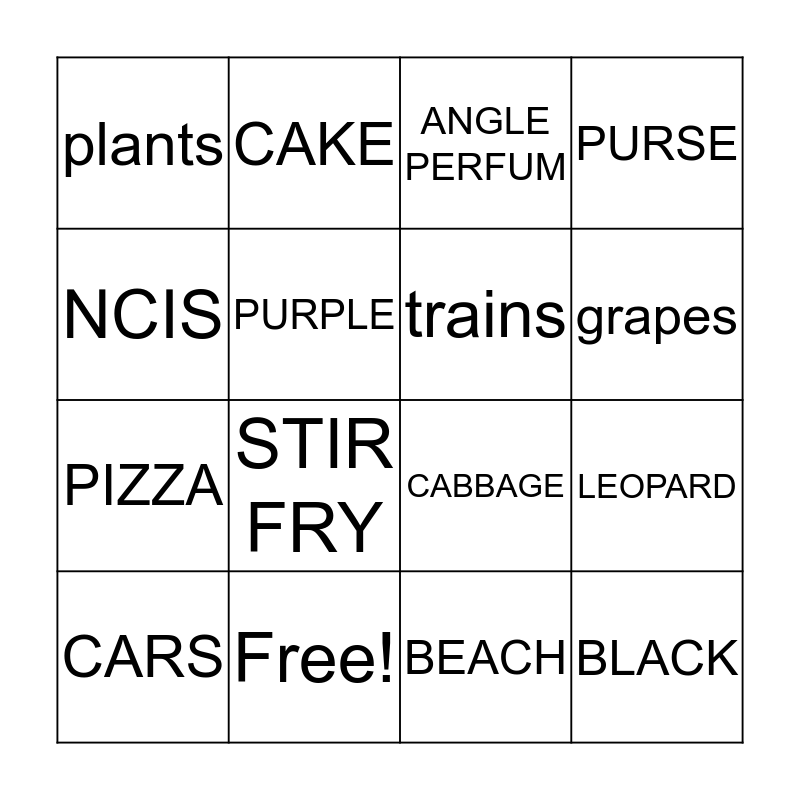This bingo card has 28 words: GREEN TEA, APPLE PIE, PIZZA, WALNUTS, PURPLE, ANGLE PERFUM, CAKE, BLACK, Free!, PUZLE, CABBAGE, PURSE, OXTAILS, DRESS, STIR FRY, travel, scarf, trains, grapes, movies, plants, mango, CARS, LEOPARD, BEACH, ROCKY ROAD, NCIS and gym.