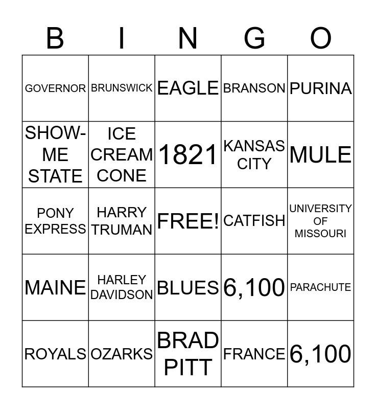 This bingo card has a free space and 24 words: HARLEY DAVIDSON, OZARKS, 1821, ROYALS, PURINA, GOVERNOR, SHOW-ME STATE, BRUNSWICK, CATFISH, BLUES, KANSAS CITY, PONY EXPRESS, 6,100, PARACHUTE, ICE CREAM CONE, FRANCE, UNIVERSITY OF MISSOURI, EAGLE, MULE, HARRY TRUMAN, 6,100, MAINE, BRANSON and BRAD PITT.