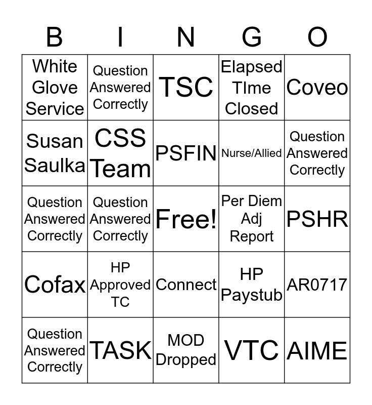 This bingo card has a free space and 24 words: HP Approved TC, TASK, PSFIN, Question Answered Correctly, Coveo, White Glove Service, Susan Saulka, Question Answered Correctly, Per Diem Adj Report, Connect, Nurse/Allied, Question Answered Correctly, HP Paystub, AR0717, CSS Team, VTC, PSHR, TSC, Question Answered Correctly, Question Answered Correctly, AIME, Cofax, Elapsed TIme Closed and MOD Dropped.