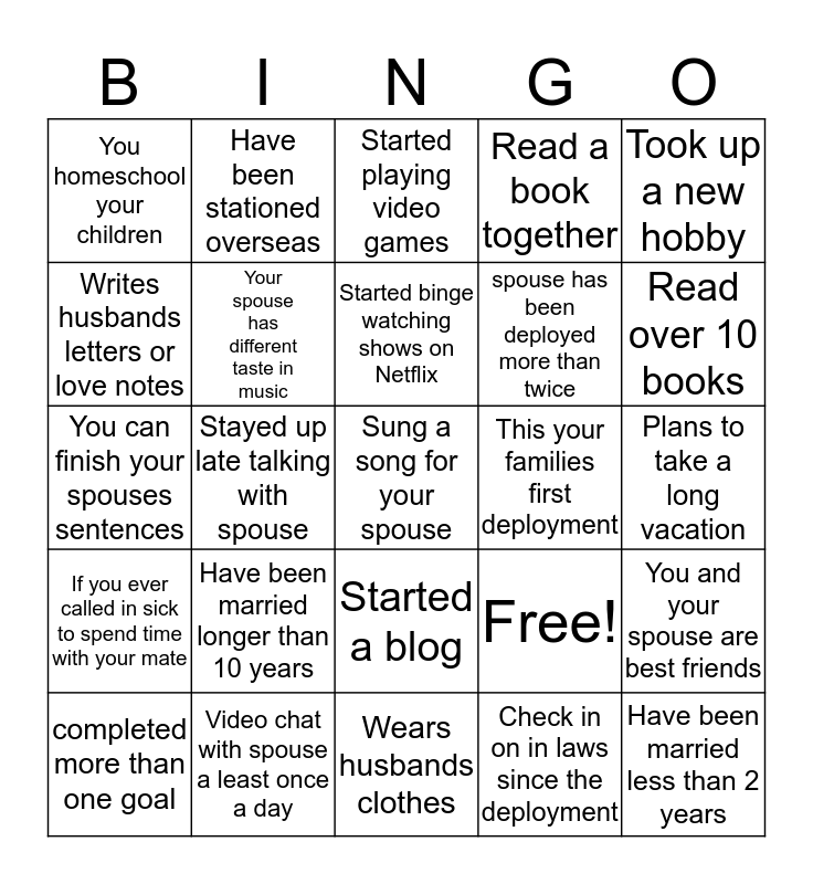 This bingo card has 25 words: Have been married longer than 10 years, Wears husbands clothes, Started binge watching shows on Netflix, completed more than one goal, Took up a new hobby, You homeschool your children, Writes husbands letters or love notes, Have been stationed overseas, This your families first deployment, Started a blog, spouse has been deployed more than twice, You can finish your spouses sentences, Free!, You and your spouse are best friends, Your spouse has different taste in music, Have been married less than 2 years, Plans to take a long vacation, Started playing video games, Read over 10 books, Stayed up late talking with spouse, Sung a song for your spouse, Video chat with spouse a least once a day, If you ever called in sick to spend time with your mate, Read a book together and Check in on in laws since the deployment.