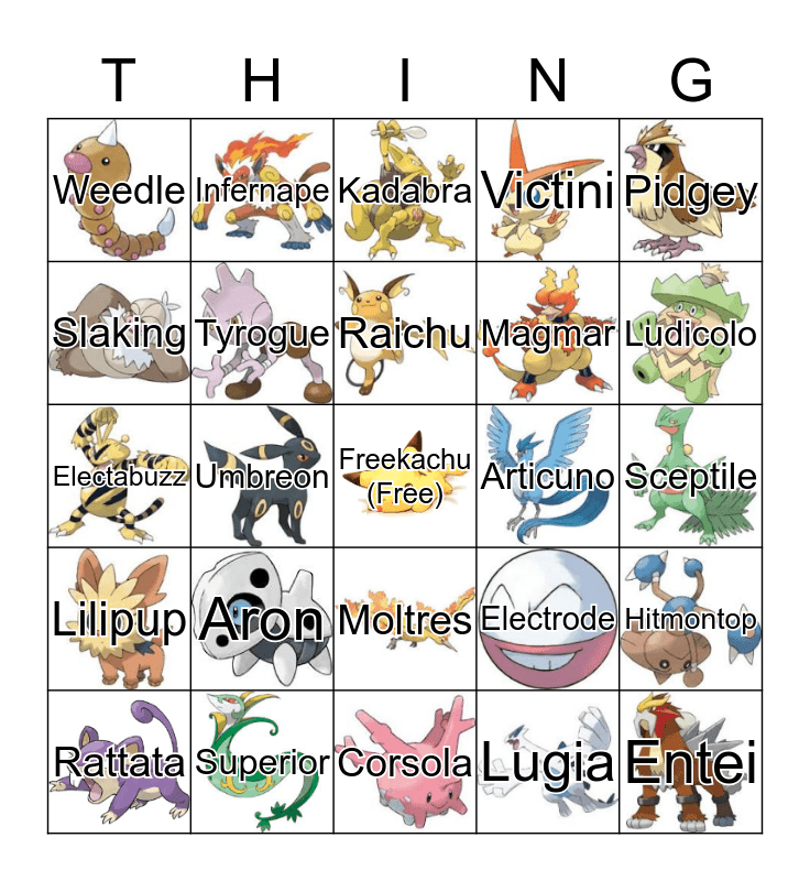 This bingo card has 24 images, a free space and 24 words: Aron, Superior, Raichu, Rattata, Pidgey, Weedle, Slaking, Infernape, Articuno, Moltres, Magmar, Electabuzz, Electrode, Hitmontop, Tyrogue, Lugia, Sceptile, Kadabra, Ludicolo, Umbreon, Entei, Lilipup, Victini and Corsola.