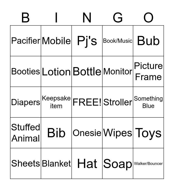 This bingo card has a free space and 24 words: Bib, Blanket, Bottle, Sheets, Bub, Pacifier, Booties, Mobile, Stroller, Onesie, Monitor, Diapers, Wipes, Toys, Lotion, Soap, Something Blue, Pj's, Picture Frame, Keepsake item, Walker/Bouncer, Stuffed Animal, Book/Music and Hat.