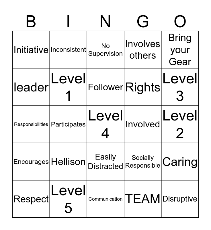 This bingo card has 25 words: Hellison, Communication, Follower, Respect, Bring your Gear, Initiative, leader, Inconsistent, Involved, Easily Distracted, Rights, Responsibilities, Socially Responsible, Caring, Level 1, Disruptive, Level 2, No Supervision, Level 3, Participates, Level 4, Level 5, Encourages, Involves others and TEAM.