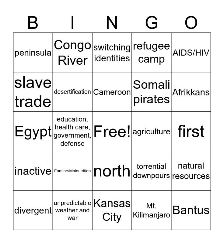 This bingo card has a free space and 24 words: Famine/Malnutrition, unpredictable weather and war, Cameroon, divergent, AIDS/HIV, peninsula, slave trade, Congo River, agriculture, north, Somali pirates, Egypt, torrential downpours, natural resources, desertification, Mt. Kilimanjaro, first, switching identities, Afrikkans, education, health care, government, defense, Bantus, inactive, refugee camp and Kansas City.