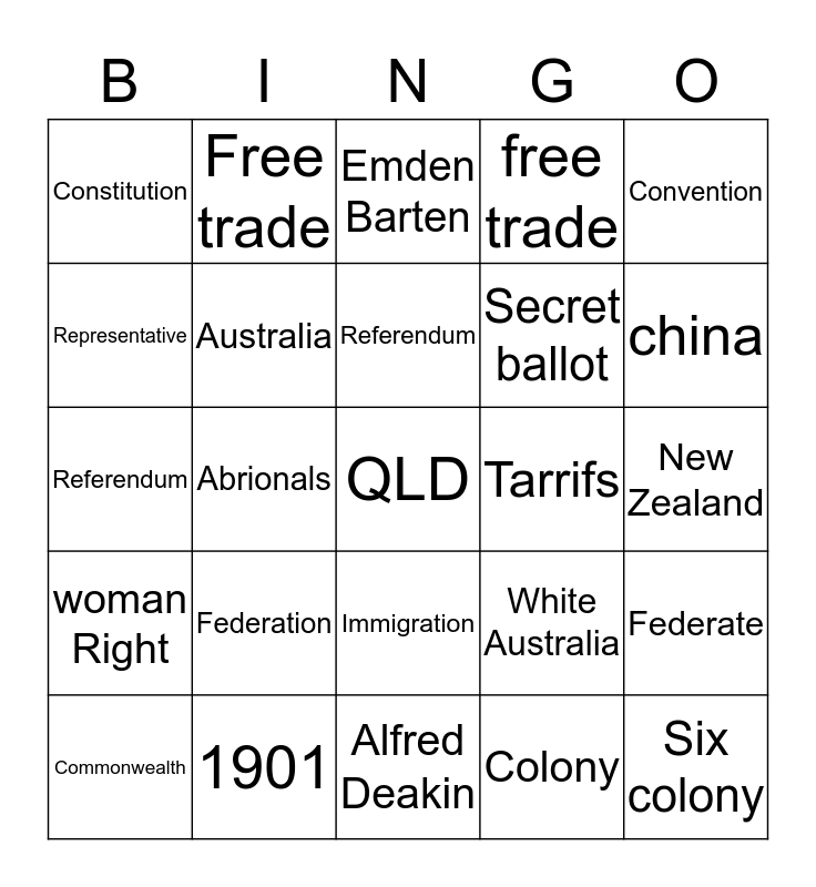 This bingo card has 25 words: Federation, Alfred Deakin, Referendum, Commonwealth, Convention, Constitution, Representative, Free trade, Tarrifs, Immigration, Secret ballot, Referendum, White Australia, Federate, Australia, Six colony, New Zealand, Emden Barten, china, Abrionals, QLD, 1901, woman Right, free trade and Colony.