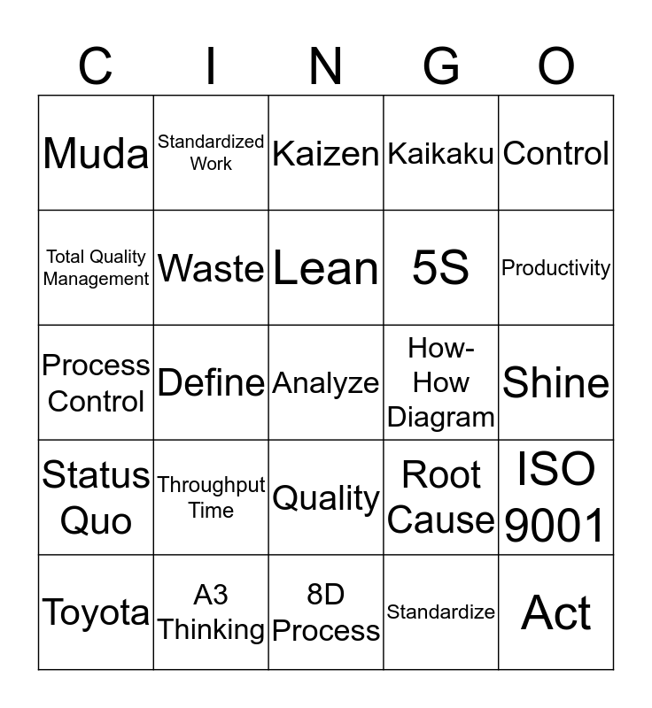 This bingo card has 76 words: Free!, Japanese, Kaizen, Continuous Improvement, Benchmarking, Deming Cycle, Shewhart Cycle, Plan, Do, Check, Act, Six Sigma, Lean, Total Quality Management, DMAIC, Define, Measure, Analyze, Improve, Control, Process Variation, Process Control, Waste, Standardized Work, Kaikaku, Efficiency, Effectiveness, 5 Whys, Process Measures, Voice of the customer, Total Employee Involvement, Master Black Belt, Champion, Root Cause, Productivity, 5S, Sort, Set in order, Shine, Standardize, Sustain, Process Mapping, SIPOC Diagram, Input, Process, Output, Toyota, Muda, Corrective Actions, CTQ, ISO, Quality, Value, Cause and Effect Diagram, Ishikawa Diagram, Mura, Muri, SMART, 80-20 Rule, Performance Management, Throughput Time, Value-Added Analysis, Business Process Automation, Process Innovation, Change Management, Organizational Excellence, How-How Diagram, Affinity Diagram, Masaaki Imai, Gemba, ISO 9001, Status Quo, A3 Thinking, DMADV, 8D Process and KJ Analysis.