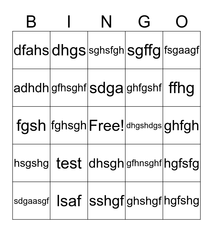 This bingo card has a free space and 24 words: test, lsaf, sdga, sdgaasgf, fsgaagf, dfahs, adhdh, dhgs, dhgshdgs, dhsgh, ghfgshf, fgsh, gfhnsghf, hgfsfg, gfhsghf, ghshgf, ghfgh, sghsfgh, ffhg, fghsgh, hgfshg, hsgshg, sgffg and sshgf.