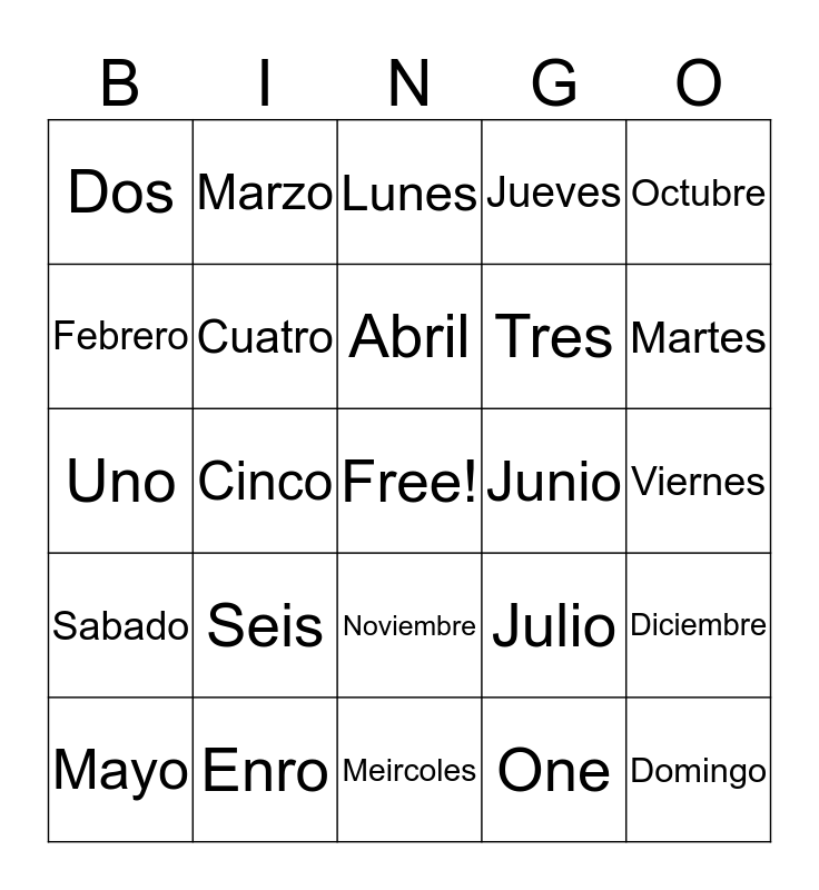 This bingo card has a free space and 24 words: Seis, Enro, Abril, Mayo, Octubre, Dos, Febrero, Marzo, Junio, Noviembre, Tres, Uno, Julio, Diciembre, Cuatro, One, Viernes, Lunes, Martes, Cinco, Domingo, Sabado, Jueves and Meircoles.