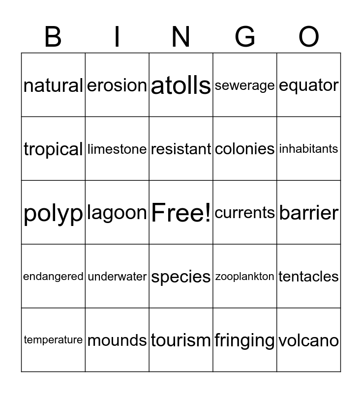This bingo card has a free space and 24 words: underwater, mounds, resistant, temperature, equator, natural, tropical, erosion, currents, species, colonies, polyp, zooplankton, tentacles, limestone, fringing, barrier, atolls, inhabitants, lagoon, volcano, endangered, sewerage and tourism.